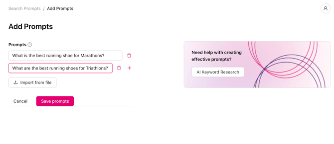 You can add individual or custom search prompts or potential questions of your customers in three ways.