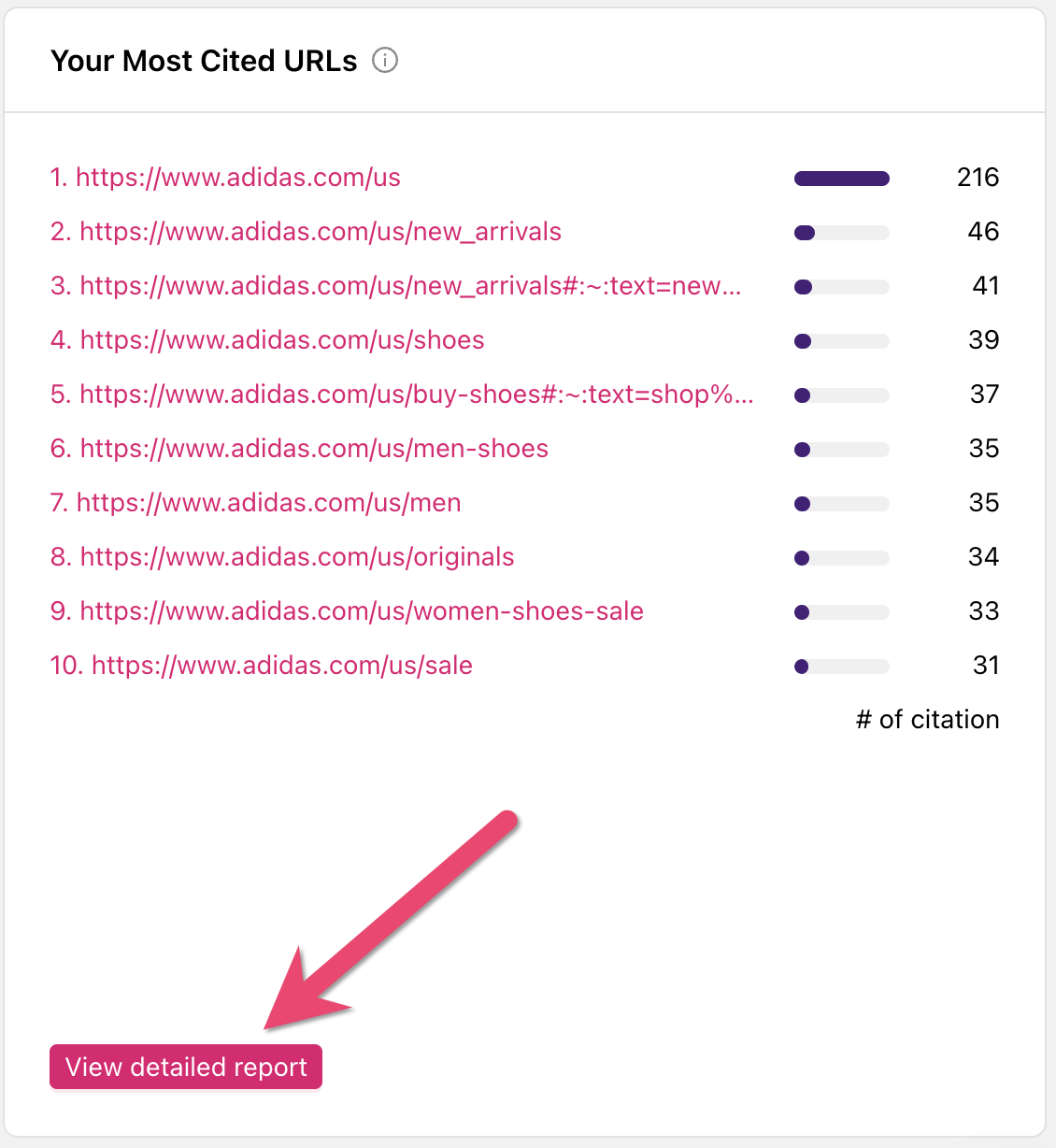 Clicking on the [+] next to the domain, you can see all citation urls filtered by this domain. You can also filter for a specific AI search engine.