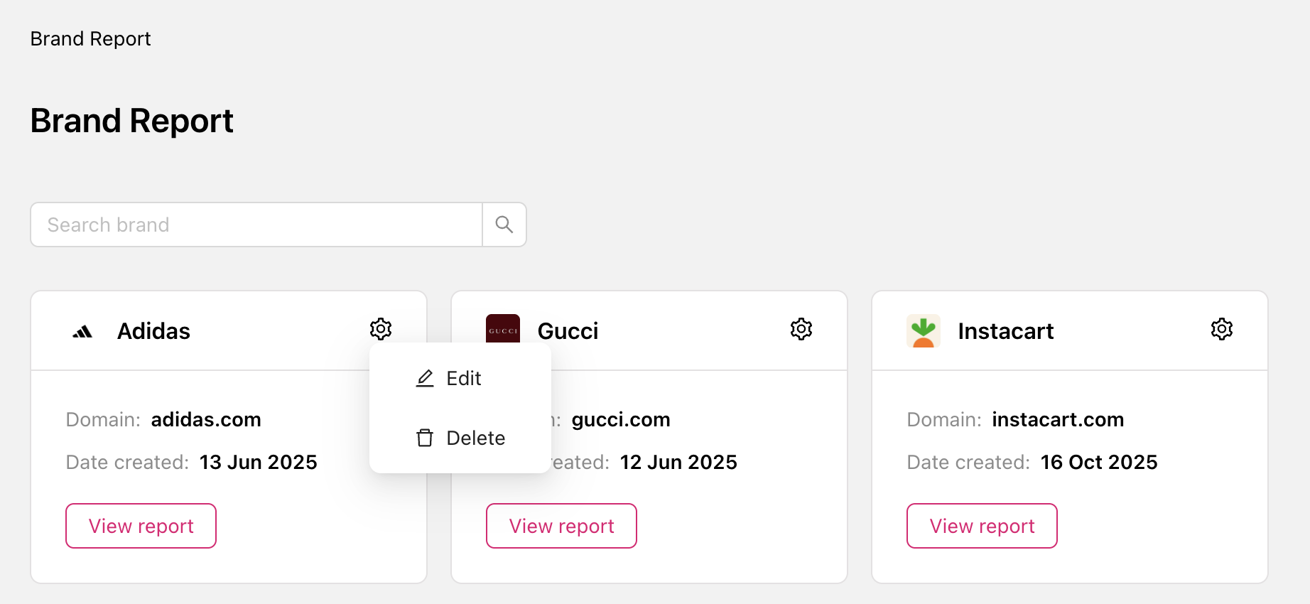 You can delete a brand report by clicking on Brand reports in the left navigation.