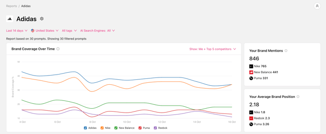You can see them in the Brand Coverage Over Time (brand visibility) or in the Brand Ranking.